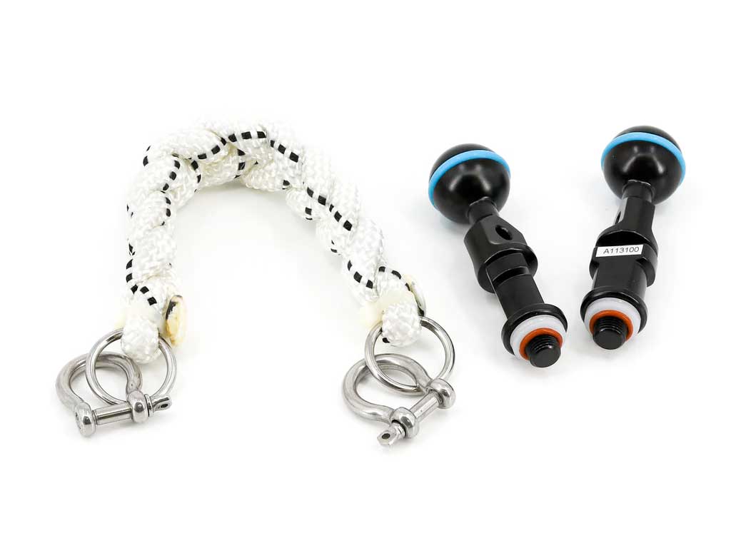A set of M10 Strobe Mounting Balls along with a 20cm lanyard with shackles. The M10 ball mounts have drilled holes for the shackles of the lanyard.