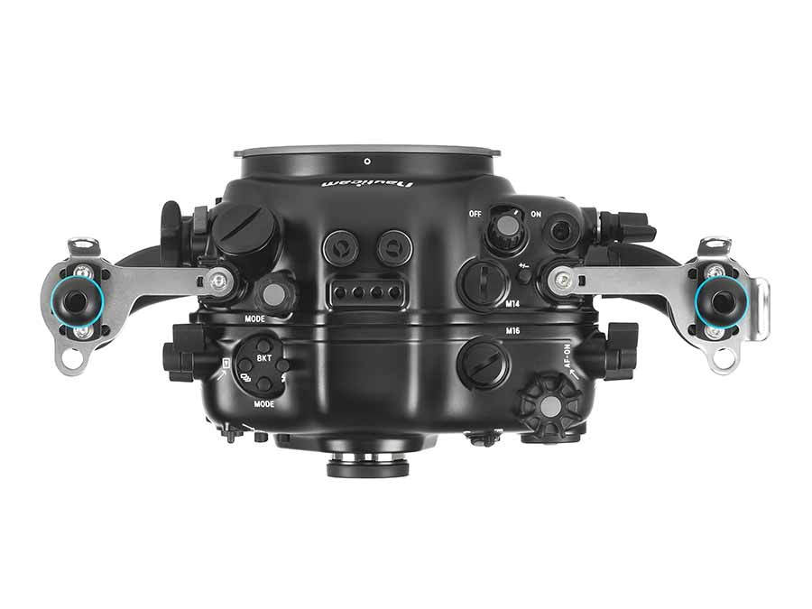 Essential control are placed within easy reach of the ergonomic handles and easy setup means more time in the water and less time working on your rig. Within easy reach of the ergonomic left handle are finger-actuated levers for the customizable ‘Fn1’ and ‘Fn2’ buttons as well as the AF-Mode button. A double thumb lever triggers the PLAYBACK and DISP buttons. On the right side is a double thumb lever for the AF-ON and REC control as well as recessed lever for ISO and a forward placed lever for the ‘Fn1’ button.